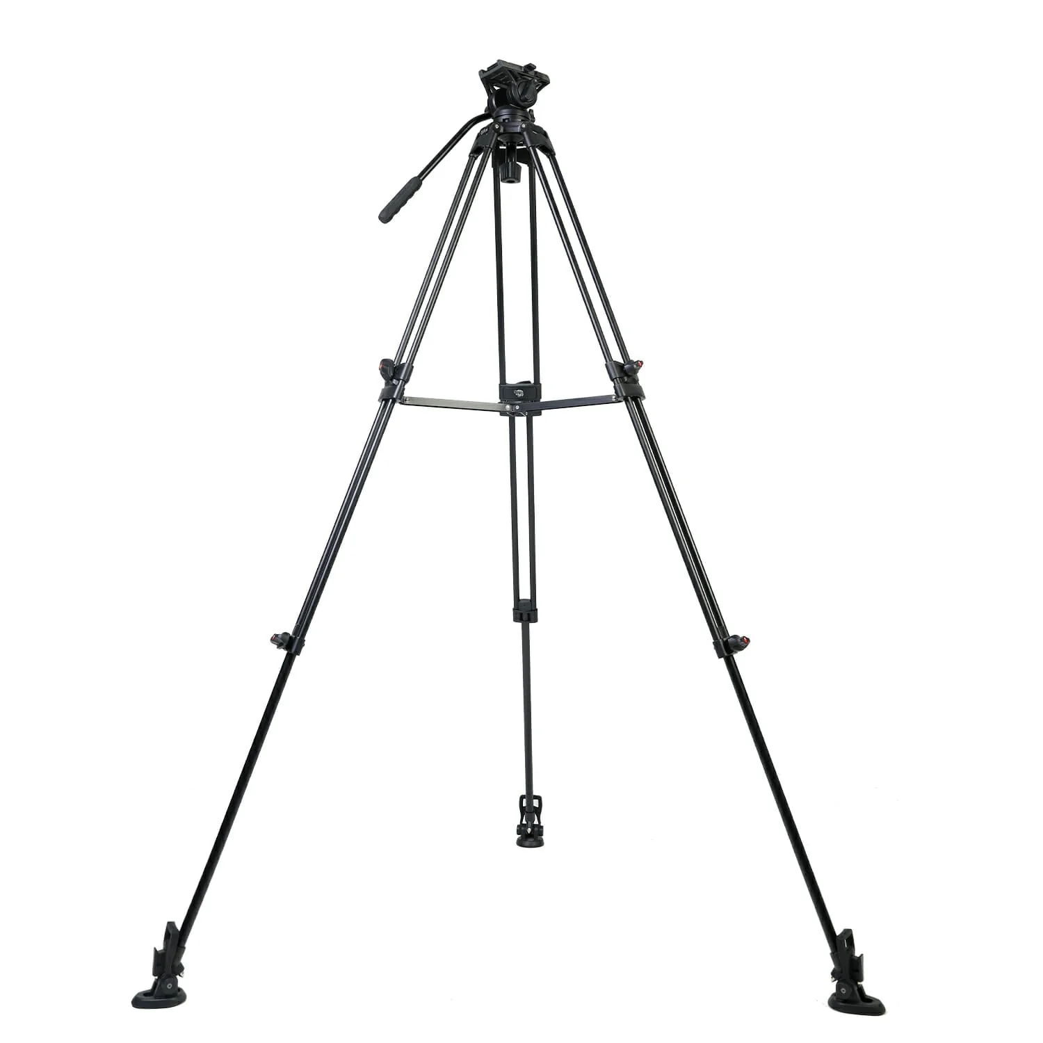 The head mounts to the leg via a 75 mm hemisphere adapter for quick leveling. Aluminum legs range in height from 31 to 63 inches, with intermediate spreader attached.