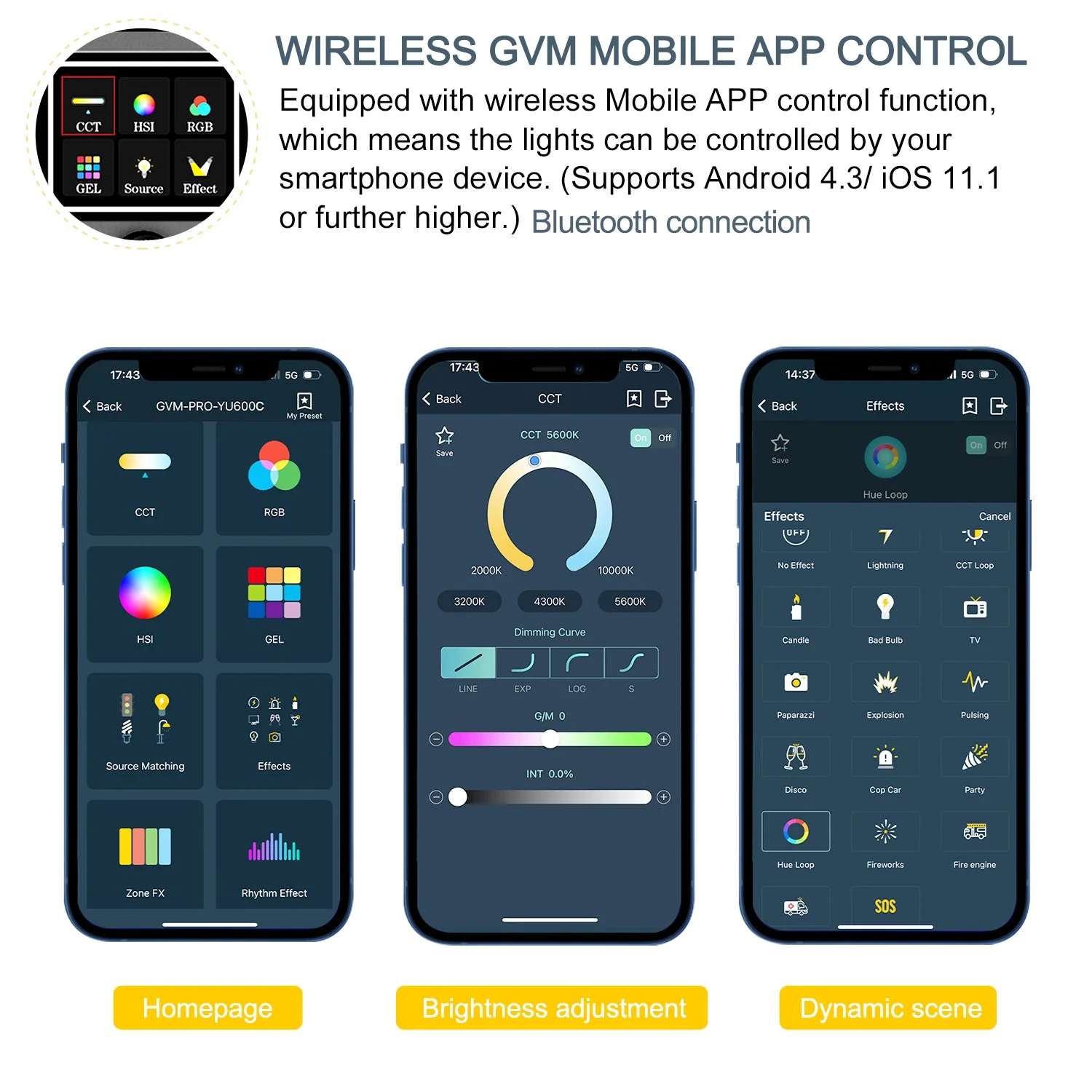 Equipped with Bluetooth 5.0 mesh networking system, you can search “gvm_led” in the app store and download mobile app (IOS and Android) to remotely control the light;